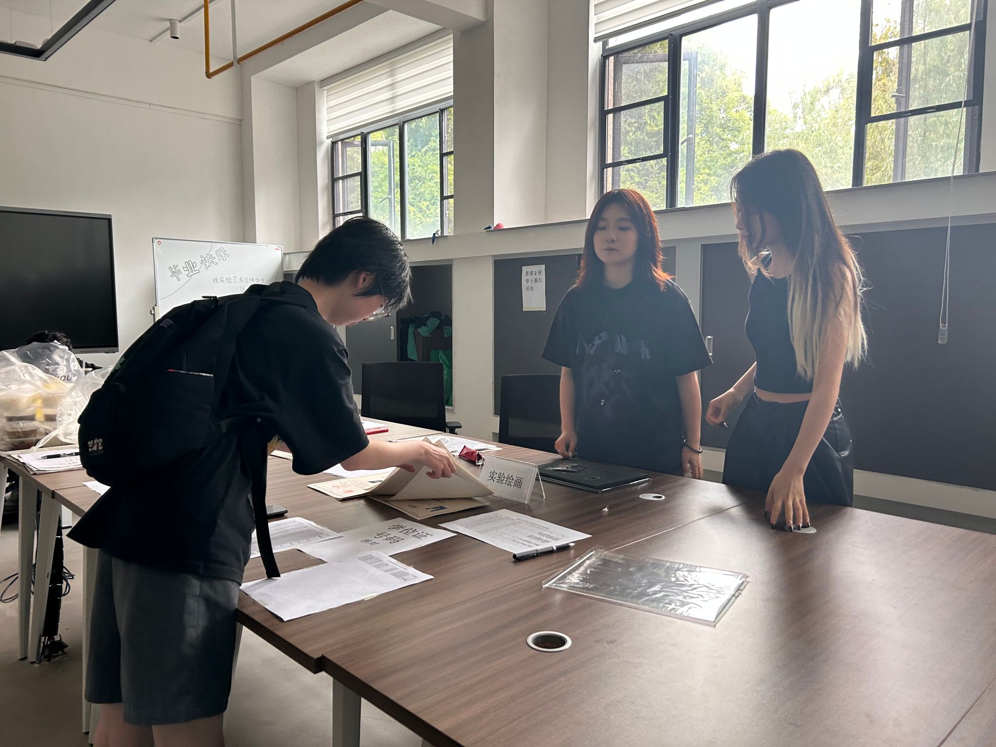 6月26日清晨,实验艺术志愿者和全体毕业生从昙华林校区出发乘坐专车前往藏龙岛校区体育馆参加毕业典礼活动。校领导、教师代表、家长代表以及毕业生们齐聚一堂,共同见证了这一激动人心的时刻。毕业生们身着学位服,脸上洋溢着自信的笑容,依次上台领取学位证书,这一刻,是他们人生中的重要里程碑。会后,毕业生在藏龙岛校区内合影留恋。志愿者们在A12-105为家长们布置了临时休息区,相关保障服务工作。