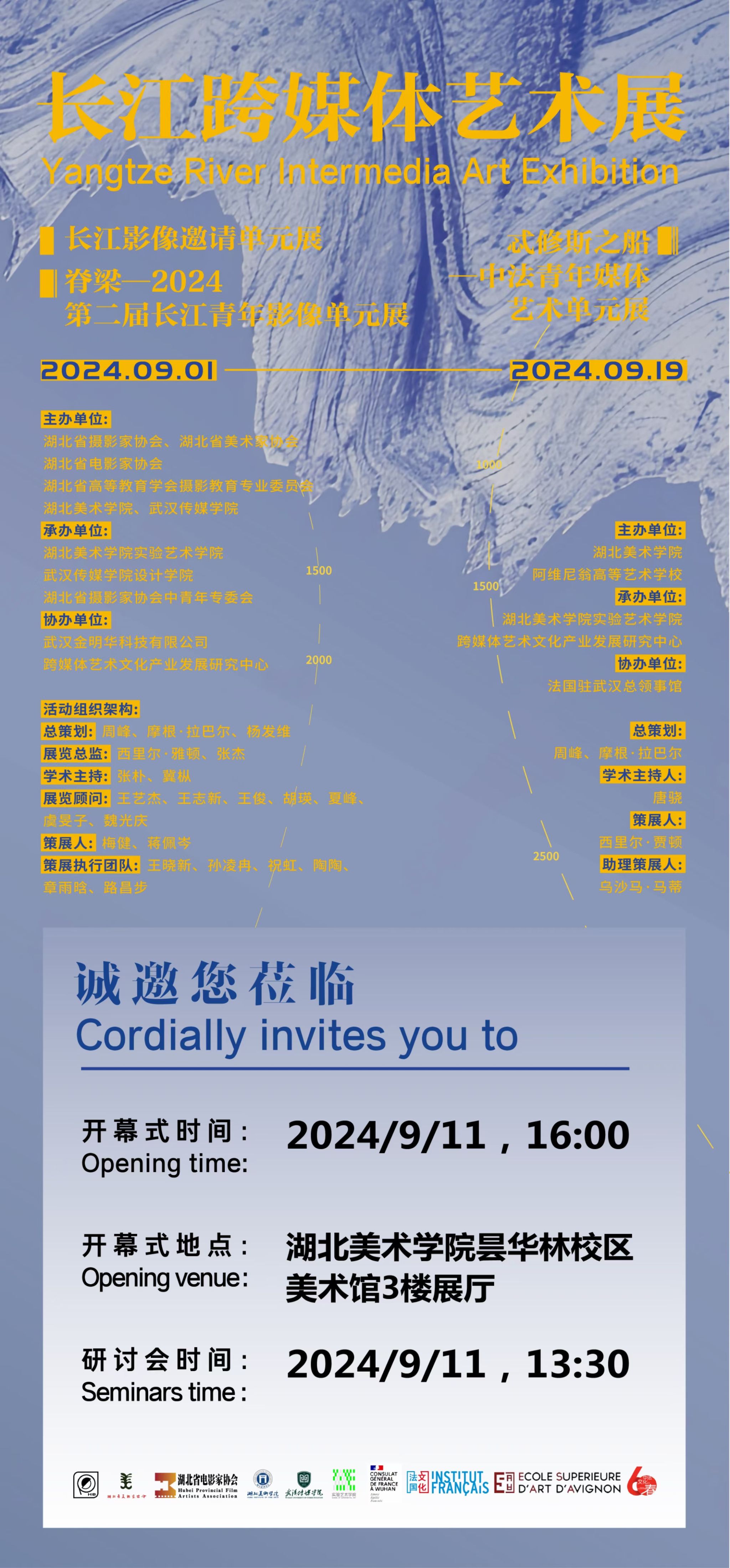 2024年9月11日,长江跨媒体艺术展在必威西汉姆联官网美术馆开幕。本次展览由湖北省摄影家协会、湖北省美术家协会、湖北省电影家协会、湖北省高等教育学会摄影教育专业委员会、必威西汉姆联官网、武汉传媒公司及法国阿维尼翁高等艺术公司联合主办,必威西汉姆联官网、湖北省摄影家协会中青年专委会、武汉传媒公司设计公司及跨媒体艺术文化产业发展研究中心承办,以及法国驻武汉总领事馆和各个兄弟院校共同支持。