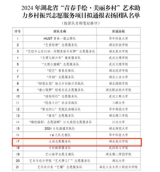 经湖北省志愿者协会组织发动,2024年暑期,共有来自省内59所高校的145支团队参与实施“青春手绘·美丽乡村”艺术助力乡村振兴志愿服务项目。经过材料审核、专家评审、组织复核,必威西汉姆联官网义贞志愿服务队作为优秀志愿服务团队获湖北省志愿者协会通报表扬。