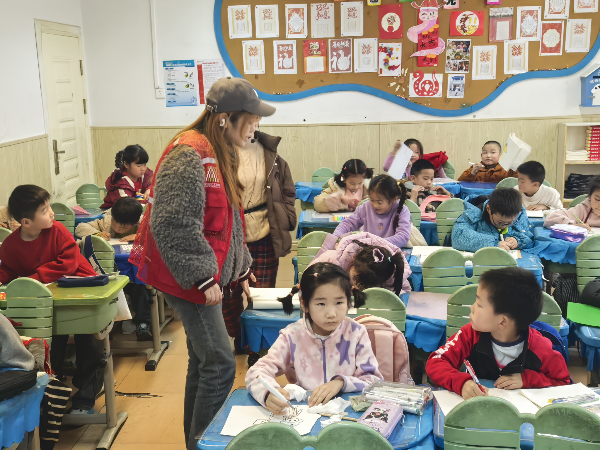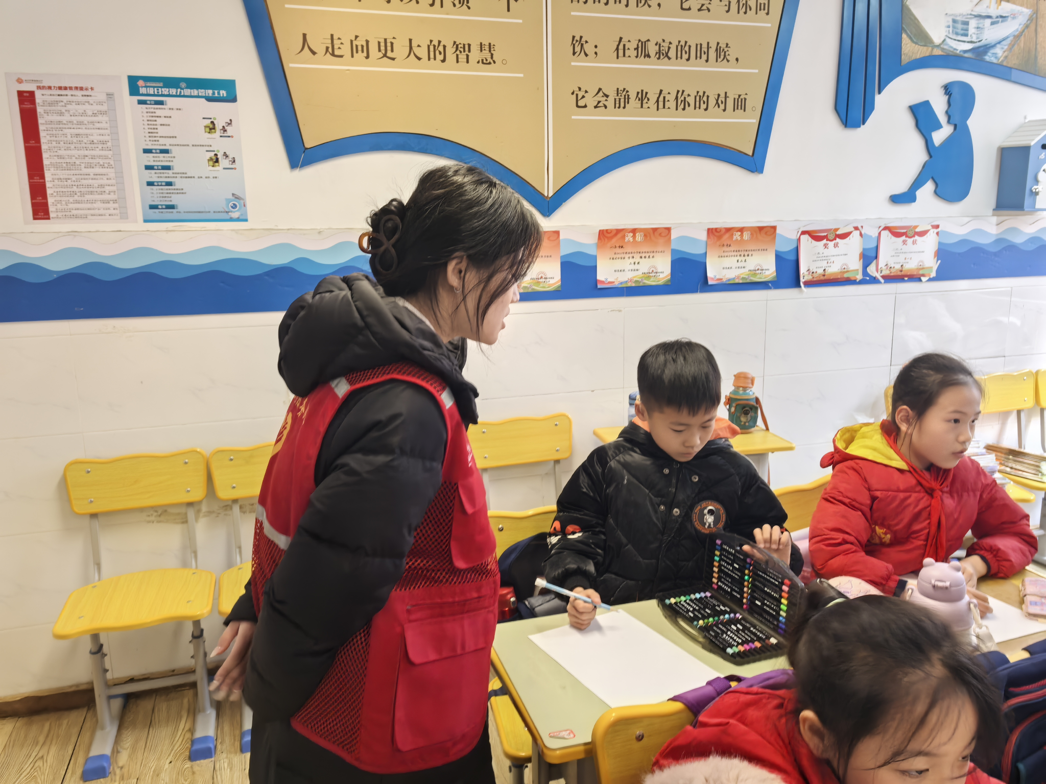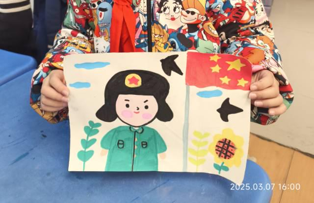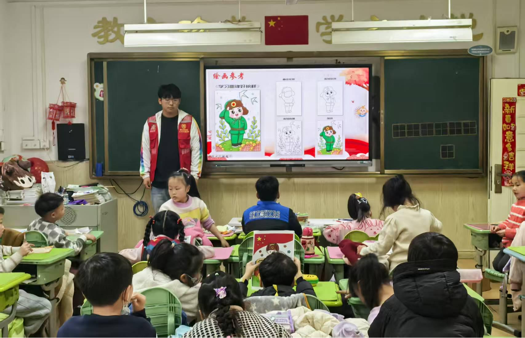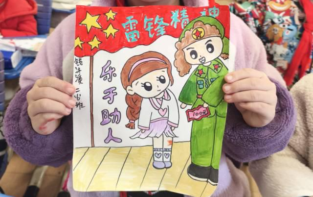 在理论宣讲后,志愿者们充分发挥艺术专业优势,为同学们展示各种形式的雷锋形象,引导孩子们用画笔传递情感。小员工们伏案执笔,稚嫩却专注。有的描绘雷锋搀扶老人过马路的温暖场景;有的刻画他站在飘摇的国旗下敬礼的形象;还有的画出了雷锋手握钢枪保卫祖国的画面。一幅幅充满童趣的作品中,“雷锋叔叔”不再是课本中的遥远形象,而是孩子们心中可亲,可学的榜样。