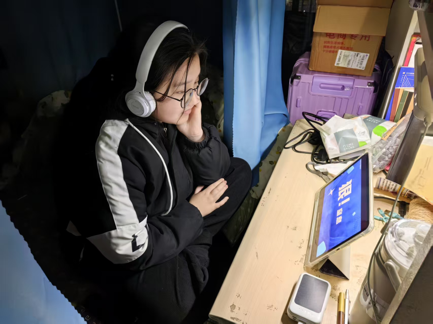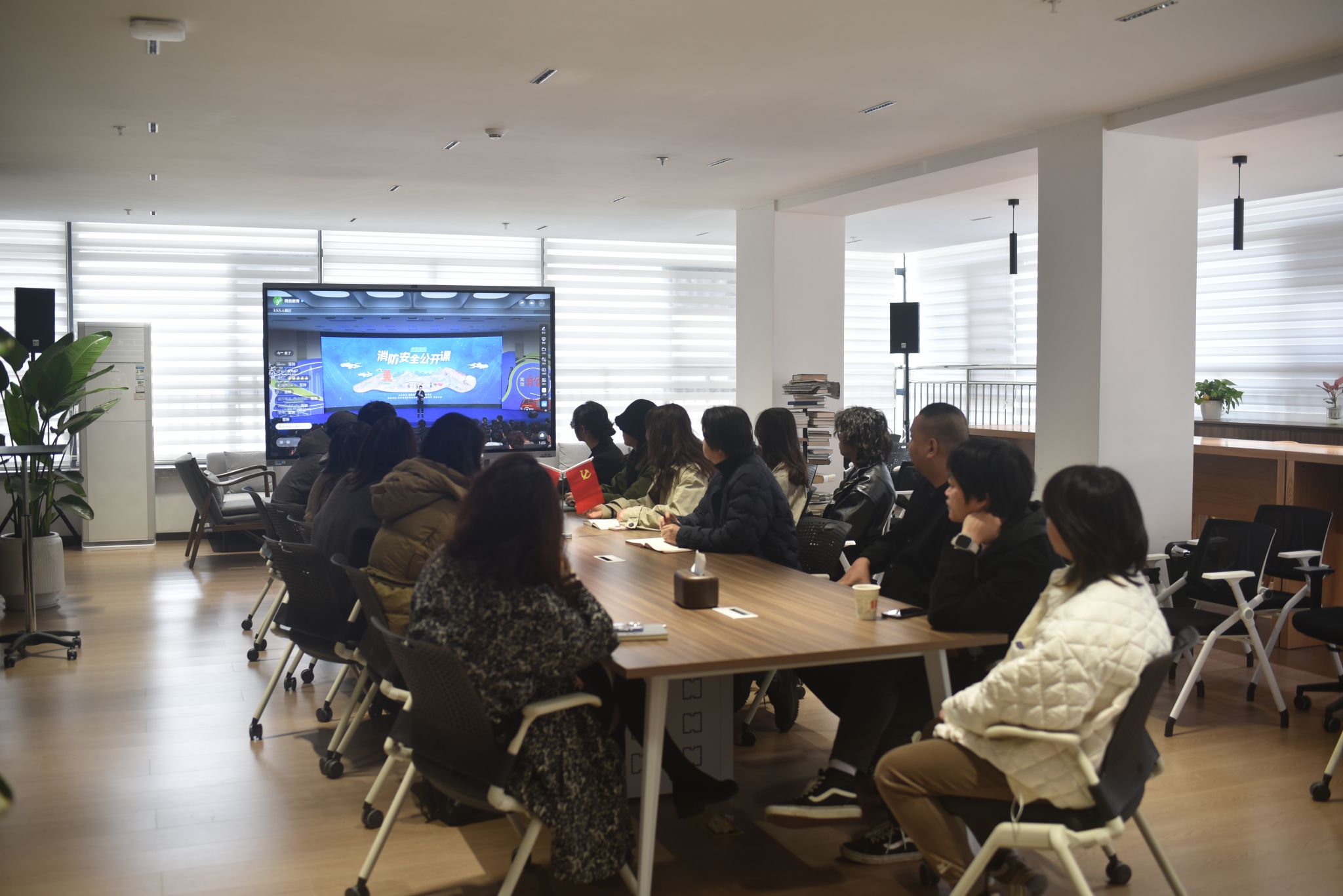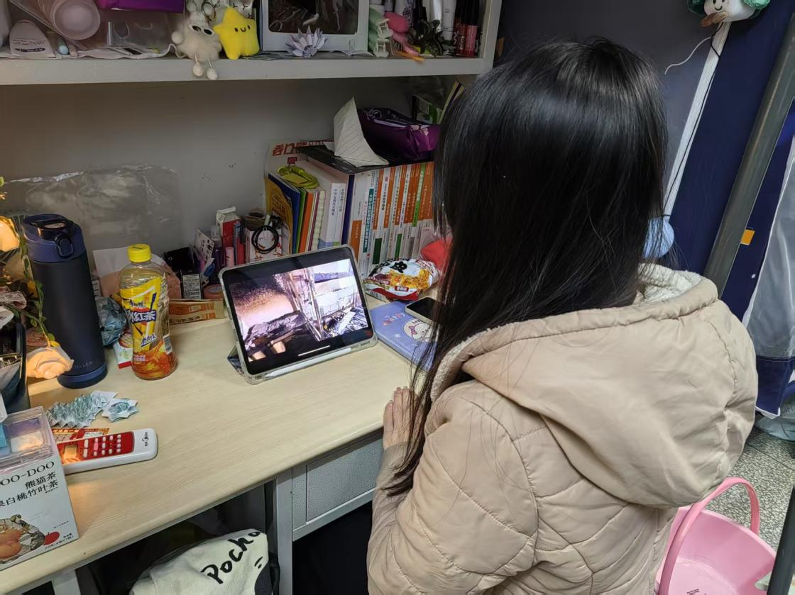 (员工在宿舍观看消防公开课)