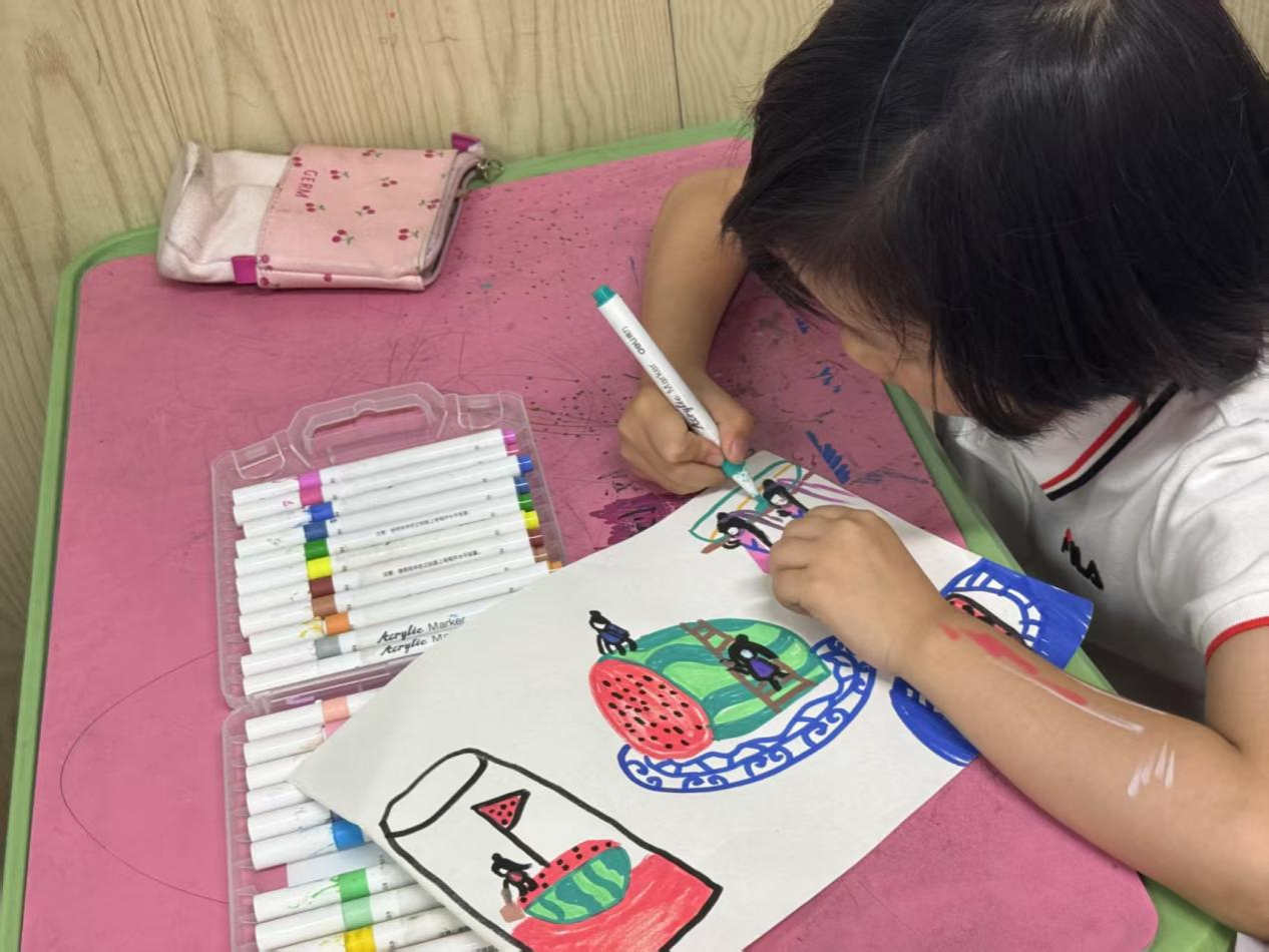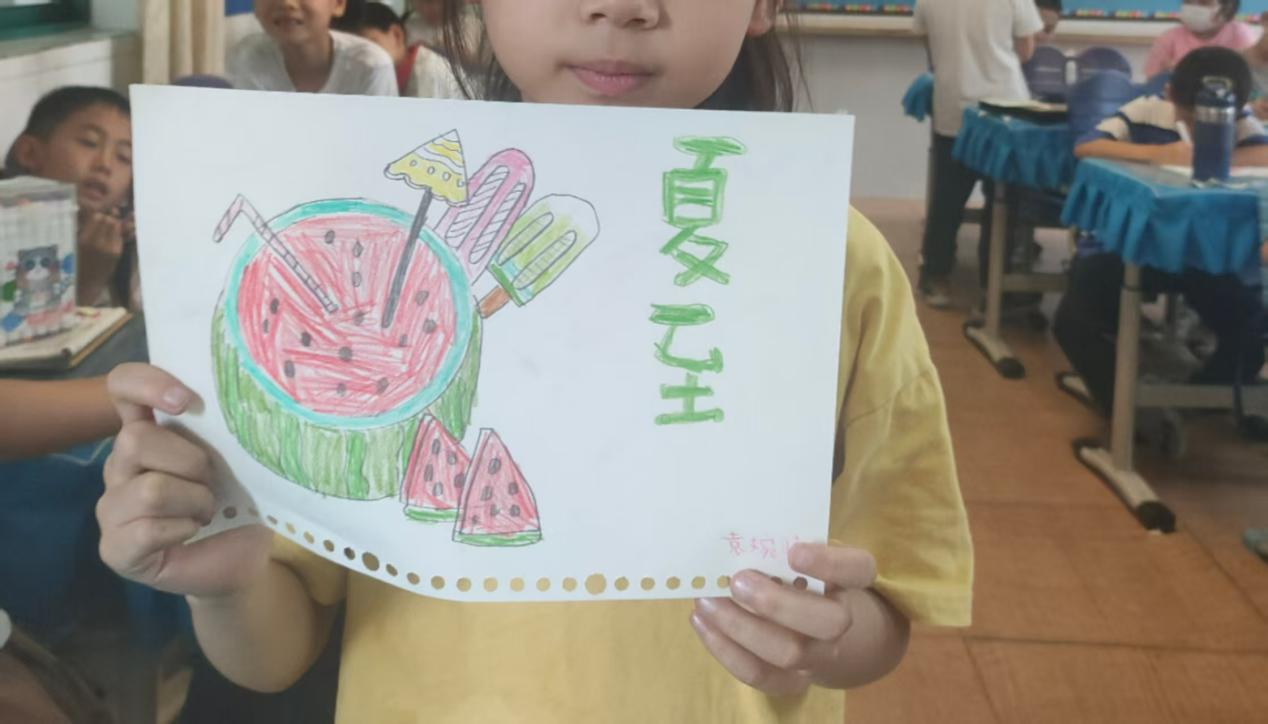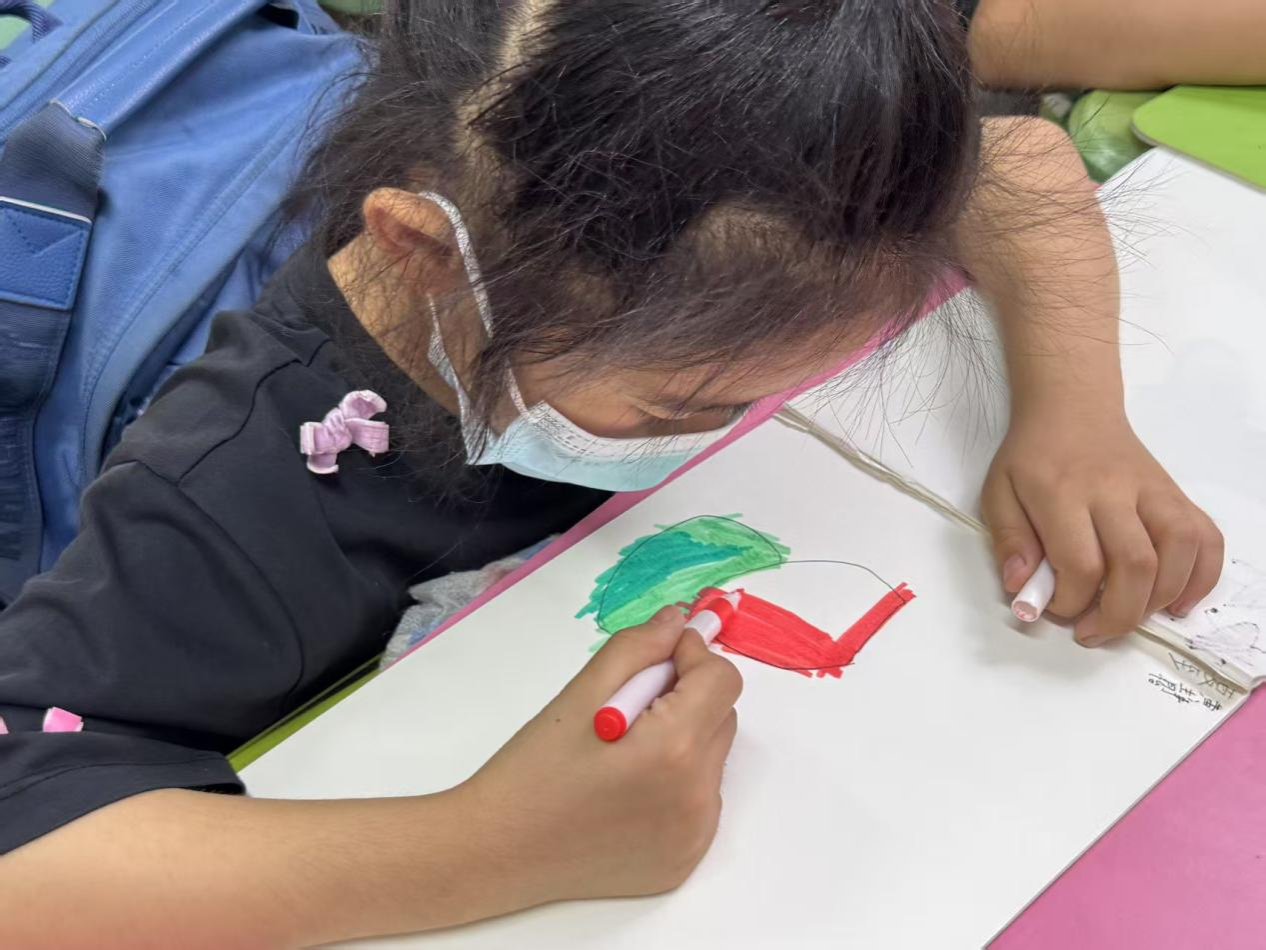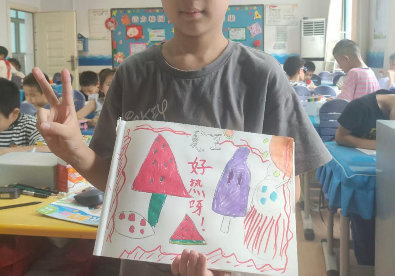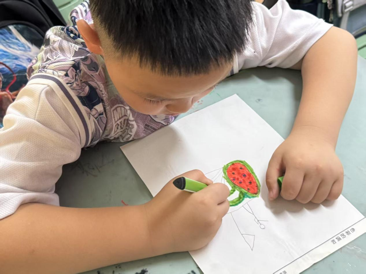 知识浸润心田后,活动进入充满创造力的核心环节——夏至主题绘画创作。公司学子充分发挥专业特长,耐心细致地引导孩子们将刚刚学到的夏至元素和心中的夏日印象转化为纸上的斑斓色彩。孩子们在志愿者哥哥姐姐们手把手的指导下,大胆运用画笔,描绘出骄阳似火、蝉鸣阵阵、绿树浓荫、清凉瓜果、欢快戏水等充满夏日气息的画面。一幅幅童真盎然、色彩明快的画作跃然纸上,不仅展现了孩子们丰富的想象力,更将他们对夏日的独特感受和对传统文化的理解生动呈现。