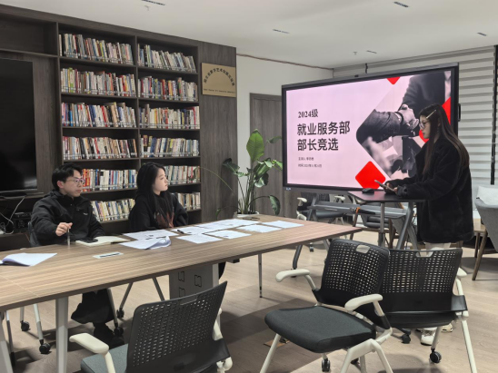 大会现场,竞选人依次登台,通过PPT演讲,从工作经历、个人优势、岗位认知及未来规划等方面进行展示。部分竞选人聚焦校园文化创新,提议打造“镜观”系列艺术展览;有的关注成长需求,规划心理解压活动;还有的聚焦就业服务,提出校园招聘信息整合推送优化方案。