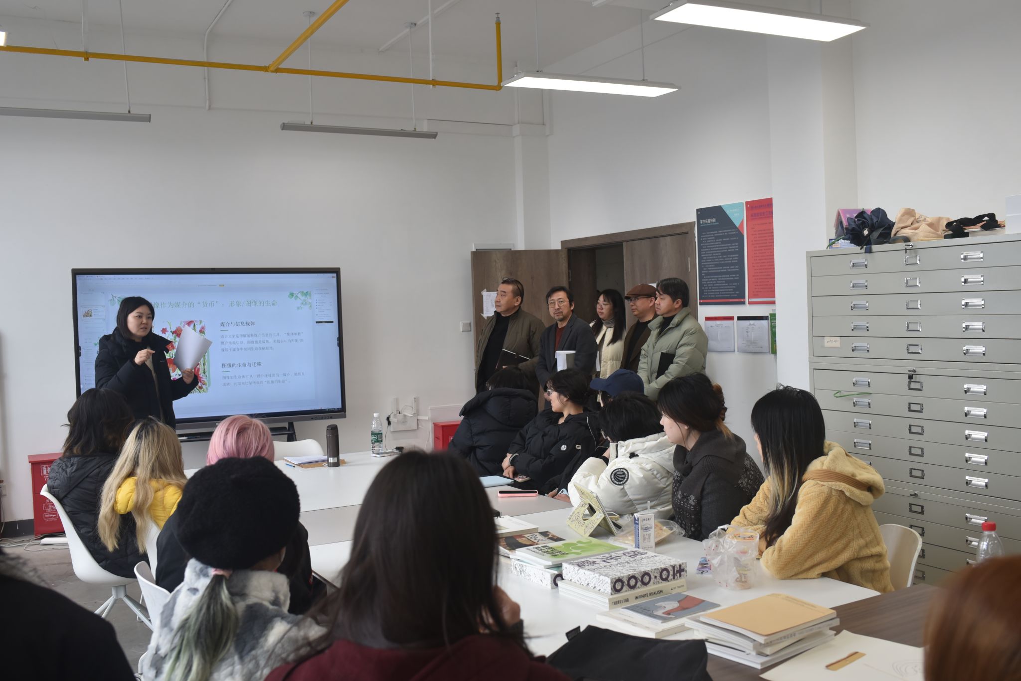 检查组一行先后走访跨媒体艺术系、实验绘画系的专业教室、数字影像实验室、综合材料工作室,实地查看教学设备调试、课程大纲准备、教学环境布置等情况。在COS—J 跨媒介艺术实验教学平台,张炼副董事长详细了解平台的技术更新与教学应用,在社群美育实验室,检查组观摩了员工社会实践项目的前期筹备,针对实验绘画系的综合材料课程准备,张炼副董事长指出:“实验艺术的核心在于创新,要持续优化课程内容,让员工在传统与当代的碰撞中探索艺术边界。”