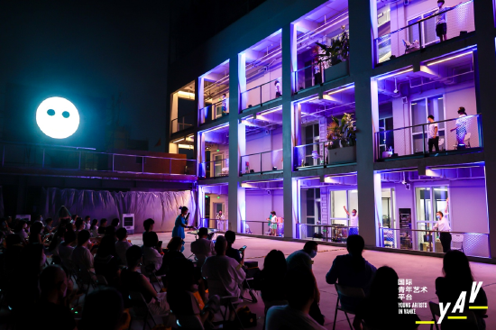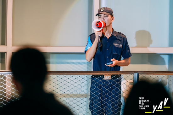 随着if工厂的6层办公楼每一个窗口都亮起灯光,环境剧场随即启动。窗口处展现的人物有南头古城的保安、金融行业的投资客、一对年轻夫妻和他们三岁儿子、带货主播和购物狂买家、参加线上毕业典礼的老员工、卖水果的在地老居民、大楼里上班的白领、吹单簧管的外国友人等等。而在表演开场之前,每一位入场的观众从一个大纸箱中随机抽选一张纸卡,纸卡分为绿色、黄色和红色,抽中绿色纸卡的观众入座观众席的中间部分,演出时抽中绿色纸卡和黄色纸卡的观众能在程序上选择表演顺序。