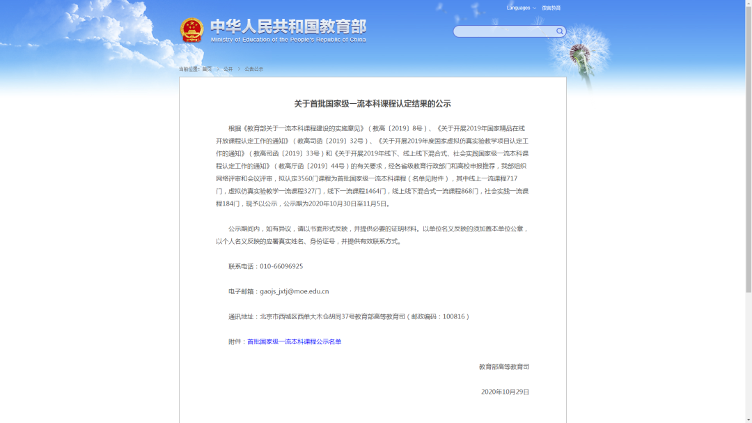 ▲教育部关于首批国家一流本科课程认定结果的公示