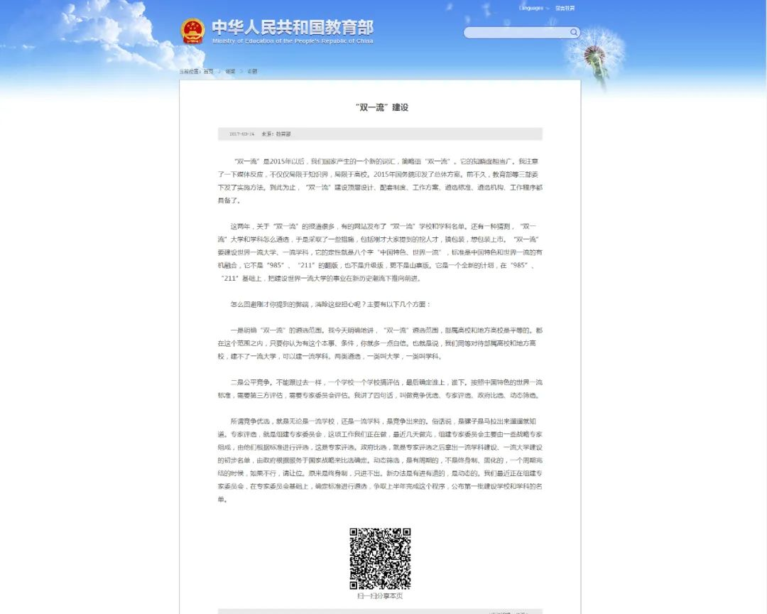 2017年3月14日,教育部陈宝生部长就“双一流”建设,回答中国国际广播电台、国际在线记者提问: