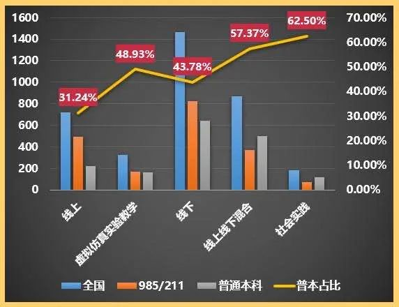 中华人民共和国教育部认定的3560门国家级一流本科课程,其中985/211高校被认定1922门,占整体认定数量的53.99%。从认定课程类型来看,仅线上线下混合式和社会实践类普通本科被认定占比超过50%。湖北省认定一流课程中线上一流本科课程56门,线上线下混合课程64门,通过图表可以看出,线上课还是以985/211高校为准,但混合课程普通本科已经占据近半壁江山,未来混合课程一定是大势所趋。湖北省96所高校中最终只有31所获批一流课程,可见竞争之激烈。